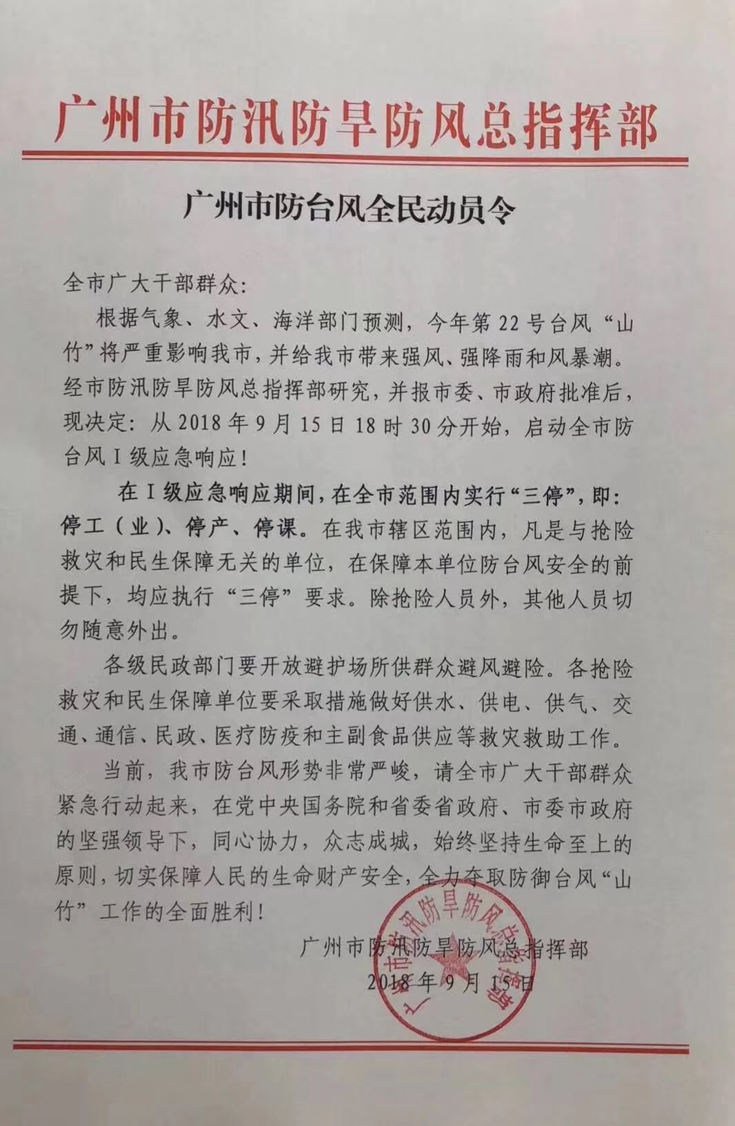 广州市科兰美轩信息科技有限公司根据市三防办的通知要求,计划于9月15---17日期间停工(停业),停产,全体员工在家休息,以安全为主,若员工家庭条件允许的,可以在保证安全的前提下,适当响应用户的紧急需求,通过网络远程处理部分客户的紧急故障问题,其它日常售后服务问题,皆在台风“山竹”过后,正常恢复工作后再行处理。 湛江市:14日21时,启动防风Ⅰ级应急响应,向全社会发布紧急动员令。15日上午,市委主要领导主持召开市战前动员会,会后前往重点地区检查防风工作落实情况。全市10242艘渔船全部回港或就近避风,32195名海上作业人员已全部上岸避险;启用避护场所及安置点766处,转移危险区域的群众115775名;全市6个滨海浴场、26个旅游景区全部关停,所有游船停航,撤离游客4521人;405个建筑工地停工,撤离23627名施工人员。琼州海峡15日9时起全线停航。驻湛部队、武警、消防官兵和全市37支应急抢险队伍全面备勤。15艘海上应急救助船舶分布在雷州半岛东西岸随时待命。东兴、富多煤气等危化品企业已提前落实抢险力量和物资,细化应急方案。供电、供水、通信、油品供应等应急保障全部到位。 茂名市:15日18时将防风应急响应提升为Ⅰ级,市委主要领导发表电视讲话,市政府发出紧急动员令,在新闻媒体滚动播出防灾公益宣传。15日上午,再次召开异地视频会议,进行再动员再部署再落实,市四套领导班子领导全部到挂钩点指挥台风防御工作,并派出五个督导组到各县区督导。全市民兵预备役人员已集结3200多人,每个镇街30人。武警、消防、公安、特警共600多人分成8个应急抢险突击队,提前预置到可能受影响的重点镇街;每个点预置抢险物资钩机、铲车、应急发电车、应急通信车各1台。截至15日18时,全市已转移危险区域人员52776人,关停16个景区景点,撤离游客2268人;关停在建工地732个,撤离务工人员9613人。2979艘渔船全部回港避风,222名渔排作业人员全部上岸。 阳江市:15日18时将防风应急响应提升为Ⅰ级,下发防台风全民动员令,全市所有高等院校、中小学校停课,所有渡口停航,所有陆地车辆(除抢险和指挥车辆外)停止行驶,市区、城镇所有商场停止营业,所有建筑工地停工,行政、企事业单位停工(除应急值守及特殊岗位人员外),所有公众聚集场所停止活动,所有旅游景点停止开放。市四套班子领导同志带队分赴各县(市、区)指挥台风防御工作。关停在建工地132个,撤离人员8909人。4301艘渔船全部回港或就近避风,3143名渔排作业人员全部上岸避险。关停12处海滨浴场、旅游景区,撤离景区人员3258人。全市启用避护场所347处,转移危险区群众16930人,安置群众9055人。驻地解放军、电力、交通、市政、供水、供电、电信等部门的15支队伍共3252人已做好应急抢险救援准备,协调驻阳江海训部队2500人,作为救灾机动力量。已将省防总调配的20台卫星电话预置基层。 江门市:15日18时将防风应急响应提升为Ⅰ级,发布全民防风防汛全民动员令。15日上午召开全市防御超强台风“山竹”紧急动员会,对防御工作进行了再动员再部署。市主要领导坐镇市三防指挥部指挥部署,市四套班子领导按照分片分线制度到各地督导防御工作。全市各级4.8万名三防责任人全部上岗到位,全市所有干部取消休假,全员在岗待命,全力做好迎战台风的准备。全市3230艘海洋渔船已全部回港避风,316名渔排人员全部上岸避险,沿海95艘商船已全部转移避风。50个受影响滨海和山区旅游景点全部关停,撤离人员5353人,其中台山上下川岛游客已全部撤离。转移安置危险区域人员29200名,启用庇护场所1174个。全市241支防汛抢险队伍共4万多人全部夙夜待命,做好应急处置准备。 广州市:省委常委、市委书记张硕辅同志赴番禺、南沙检查防御台风工作,其他市委、市政府领导同志分赴各区对防御台风工作进行督查。15日18时30分起启动防风Ⅰ级应急响应。发布短信2300 万余条,通过电视台走马字幕、微博(用户140.8万人)、微信(用户34.9万人)、网站、电台等渠道发布“台风预警提示”信息,地铁、公交、户外区域等广告屏播放防台风公益广告。已转移危险区域人员1870人,开放庇护场所429个,2086艘渔船全部回港,4510人渔船渔排人员全部上岸。关停景区26个,工地1411个。各部门应急备勤人员9578人,武警部队400人,10艘橡皮艇、6台“龙吸水”。 深圳市:省委常委、市委书记王伟中同志主持会议部署防御工作,组织全市开展防风风险隐患排查。15日20时,将防风应急响应提升为Ⅰ级,全市范围实行停工、停业、停市、停课,所有景区、户外游乐场所设备关闭,在建工地停工,航班取消,长途班线全面停运。已转移危险区域人员130927人,开放庇护场所518个,渔船回港1809艘,渔排人员上岸258人。召集驻深解放军武警部队11支,集结各类应急抢险队伍132支、抢险人员28769名,900多名应急救护人员集结待命。组织发布8000万条防台风预警信息。 中山市:15日19时10分启动将防风应急响应提升为Ⅰ级应急响应,并向全市发出告全体市民书,提醒市民注意安全,主动防灾避险。市委主要领导深入基层一线,市政府主要领导在市三防办指挥调度。全市共有820艘渔船在港避风,55宗山塘水库均在防限水位以下运行,排查地质灾害隐患点88处,组织中山军分区、武警中山支队、公安消防支队等约2200人的队伍,103艘舟艇,24顶帐篷随时准备参与应急抢险救援工作,共启
