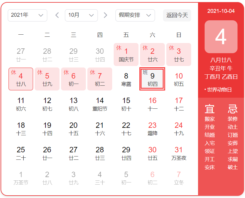 尊敬的各位新老客户和朋友: 2021年国庆节即将来临,根据国务院办公厅关于2021年节假日安排的通知并结合我司的实际情况,现将国庆节期间我司放假安排通知如下: 一、放假安排: 2021年10月1日(周五,农历八月廿五)到2021年10月7日(周四,农历九月初二)休假,共7天,2021年10月8日(周五,农历九月初三)正常上班。另因国庆放假,根据国家规定,2021年10月9日(周六,农历九月初四)正常上班,即补班。