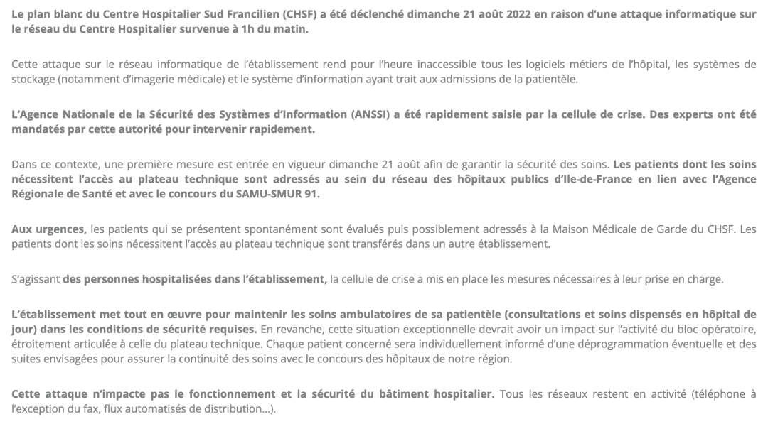 法国一医院遭黑客攻击后勒索1000万美金 LockBit 3.0嫌疑最大。Centre Hospitalier Sud Francilien(CHSF)上周日据称遭到了勒索病毒的网络攻击,导致该医院的业务软件、存储系统(尤其是医学影像)以及与患者入院有关的信息系统都暂时无法访问,医院只好将患者转移至其他医疗机构,并推迟手术预约。CHSF是一家为60万居民提供医疗服务,因此运营出现任何中断都可能危及危重病人的健康,甚至生命。 这家医院的行政管理部门尚未透露有关情况的更进一步消息,而跟医院正常运行相关的IT管理系统仍然故障中,业务系统无法运行仍在困扰着这家医院。