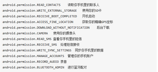 上述的这些权限能做什么,各位可以通过百度查找。 这里面有几个尤其敏感的: