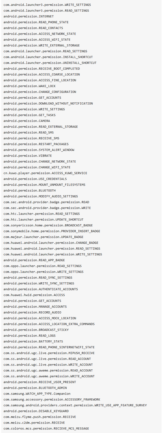近期,央视报道了今日头条选择性推送广告的行为,即今日头条有选择地避开一线城市,将虚假广告推送给二三线城市。 虽然定向推送这种技术并不新鲜,今日头条用这种技术偷偷作恶,却着实令人担忧。幸好,作恶的对象是二三线的居民,生活在一线城市的我们,似乎还可以心存侥幸? 今日头条能做到:随时对你进行定位,顺带记录和识别你和别人的谈话,外加无声拍照,窃取您手机里的机密文件,今日头条能做到。总体来讲,只有它想不想做,没有它做不到。 问题 今日头条几乎获取了所有权限。 从信息安全的角度来讲,应用应仅取得必要的权限,但是今日头条基本把敏感权限都请求了。 对今日头条客户端APK的分析结果,显示今日头条申请的权限如下: